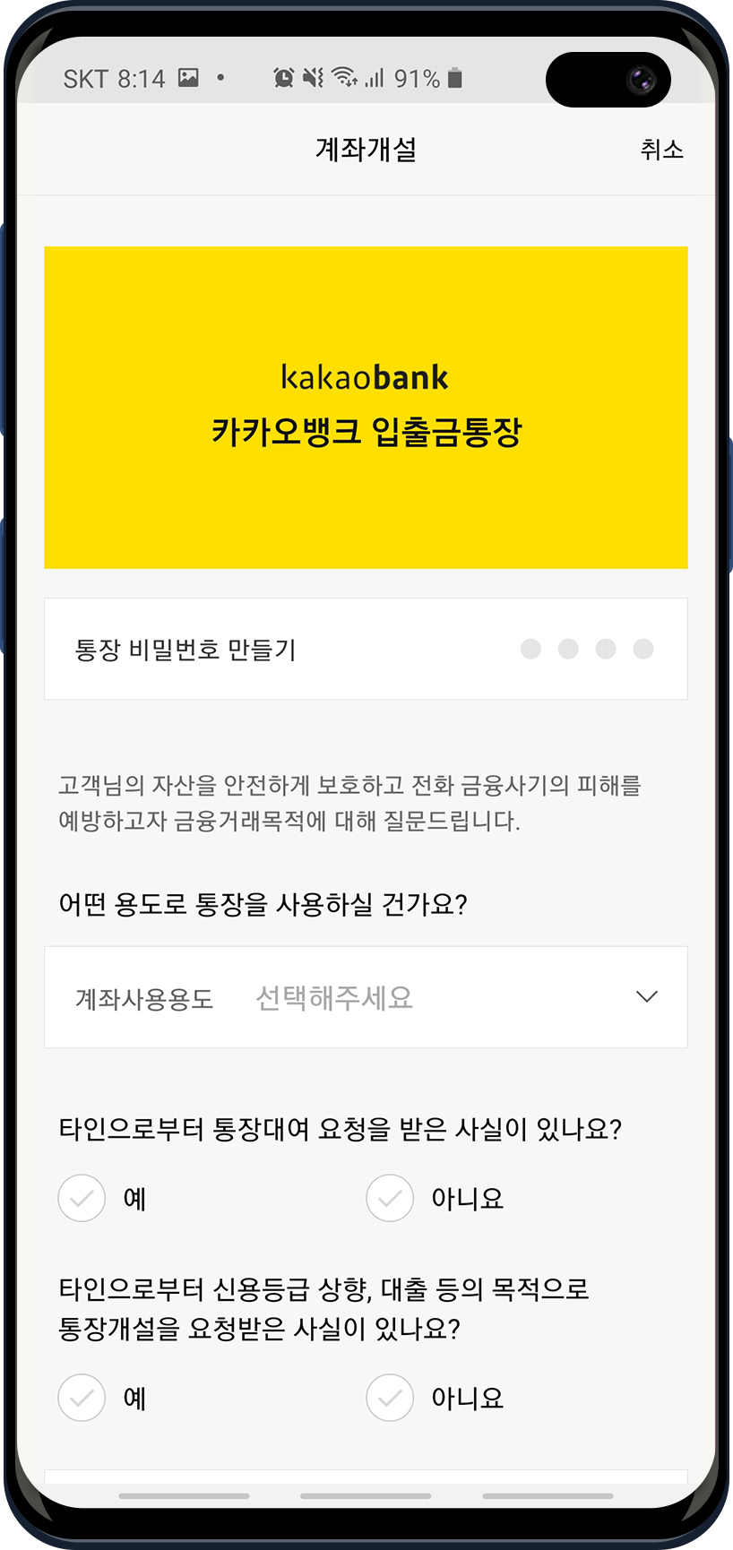 그리고 통장 비밀번호도 설정하고 통장을 사용하는 용도와 통장대여 요청을 받았는지 혹은 신용등급 상향등의 목적으로 통장개설을 요청받았는지를 체크합니다.