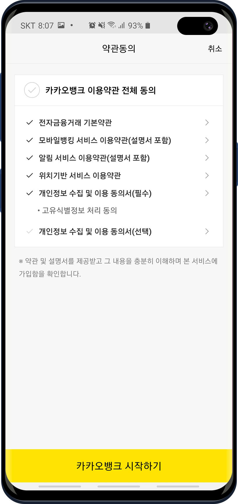 약관들 확인하고 동의한 뒤에 "카카오뱅크 시작하기"를 누르면 카뱅이 계좌개설이 시작됩니다.