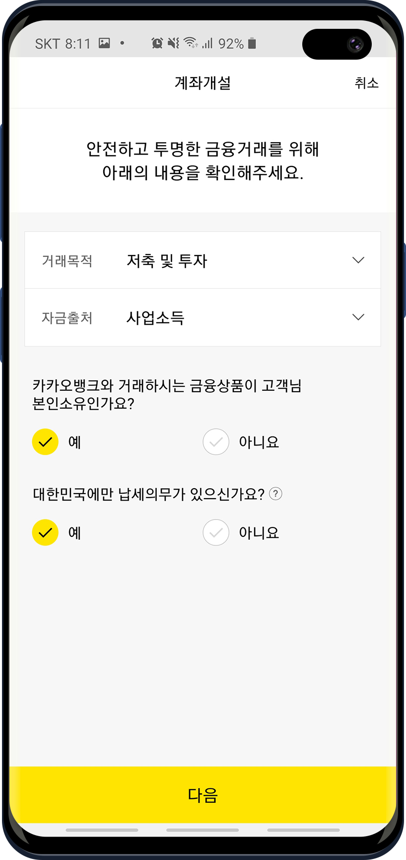 먼저 계좌 개설을 위해서 거래목적과 자금 출처등을 선택하고 카뱅과 거래한는 금융상품이 고객님 소유인지 물어보는 대답에 예, 대한민국에만 납세의무가 있으신가요?라는 질문에도 예를 대답합니다. (미국이나 해외에 납세의무가 있는지 물어보는 내용입니다. 특별한 경우가 아니면 대부분은 대한민국에만 납세의 의무를 가집니다.)