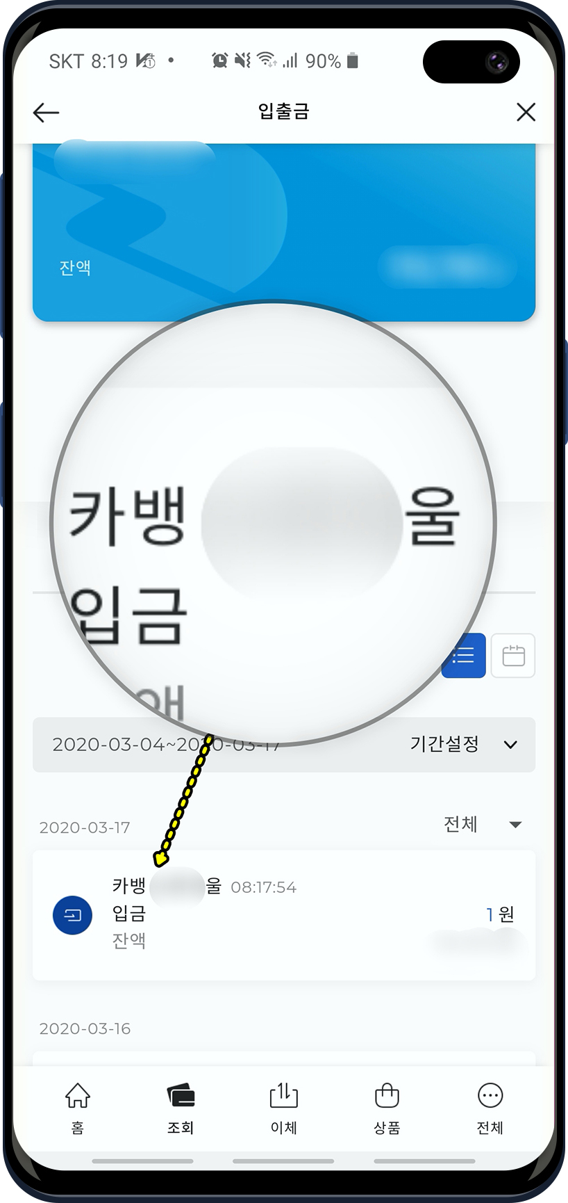 SC제일은행 앱에서 입출금 내역을 보니깐 "카뱅 XXX울" 이름으로 1원이 입금되었습니다. 저는 여기 카뱅 뒤의 "XXX울" 이름을 카뱅 입력창에 입력하면 추가 본인확인이 완료됩니다.