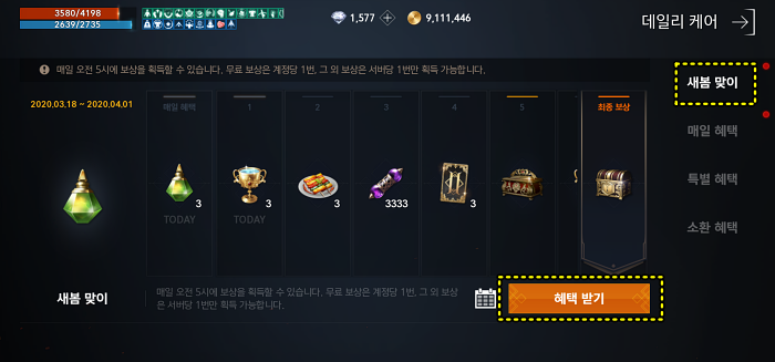이건뭐 매번 패치마다 변경되는 내용이니... 데일리 케어에 추가로 "새봄맞이 출석" 추가됩니다. 매일 출석체크 하면서 보상 받아가세용. 마지막에는 영웅무기 상자를 주는데 고급~영웅등급의 무기가 랜덤으로 나오는거라 고급등급무기라고 생각하시면됩니다.