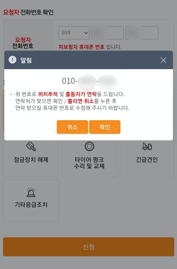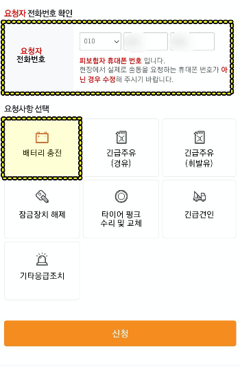 고장출동 서비스를 신청한 사람의 전화번호를 입력하고 (고장 현장에서 출동을 요청하는 번호로 입력을 해야겠죠) 요청사항을 선택합니다. 배터리 충전, 긴급주유,잠금장치 해제, 타이어 펑크 수리 및 교체, 긴급견인, 기타응급조치가 있는데 저는 차량 배터리 방전이라서 "배터리 충전"을 선택한 뒤에 신청 버튼을 눌렀습니다.