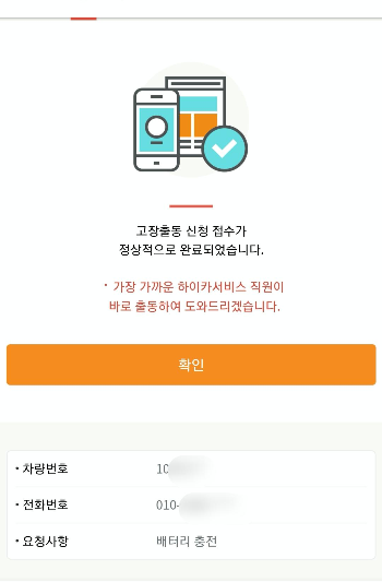이용하는 보험사가 현대해상인데 하이카 고장출동 서비스로 (특약으로 가입된 경우) 1년에 6회 무료라서 1회를 신청했습니다. 고객센터 전화하고 기다리고 그럴줄알았는데 모바일에서 간단하게 신청이 가능해서 은근 편리했습니다.