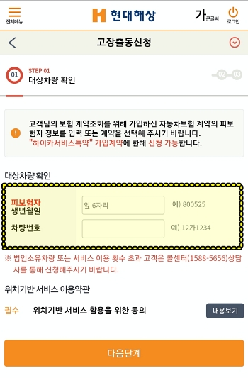모바일 서비스 신청하면 "대상 차량 확인"을 진행합니다. 피보험자의 생년 월일 앞 6자리와 차량 번호를 입력한 뒤 다음 단계 버튼을 누르면됩니다.