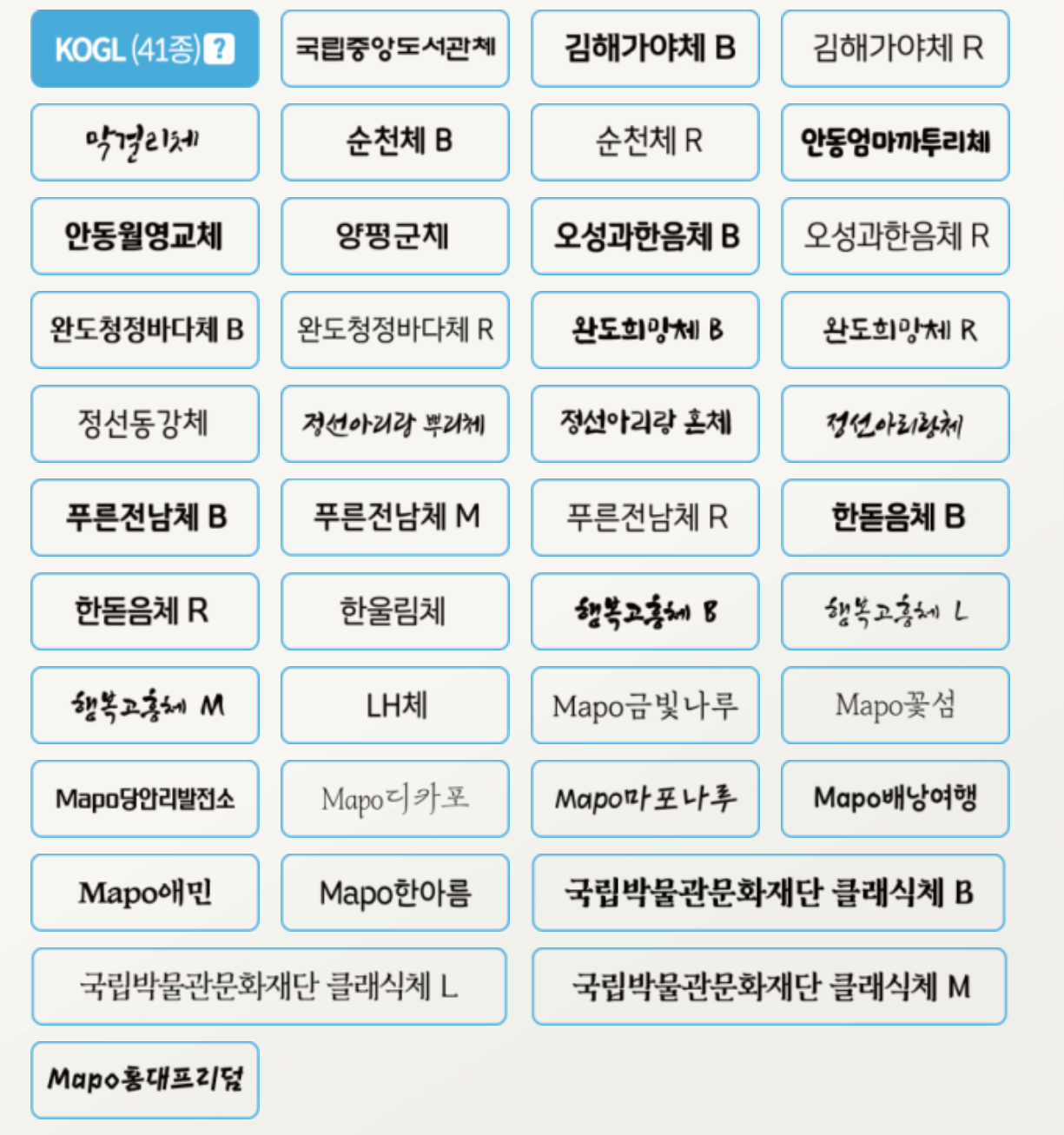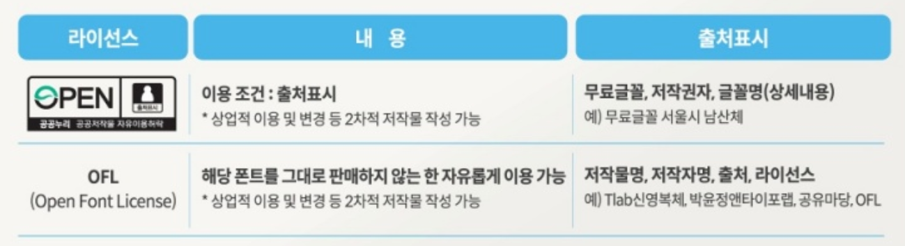 여기서 "KOGL"은 "공공저작물 자유이용 허락표시 기준"으로 문화체육관광부가 공공저작물 이용허락 간소화를 위해 만든 기준입니다. 해당 폰트들은 "제1유형 : 출처 표시" 로 해당 폰트들을 사용해서 컨텐츠를 만들 경우 상세내용에 해당 폰트 출처를 표시해야합니다.