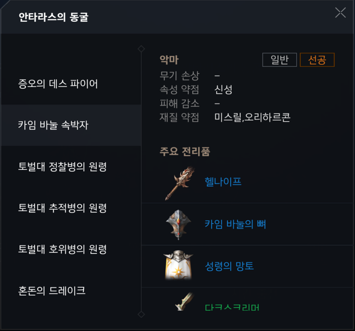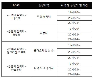 출몰 지역은 피의 늪지대 / 처형터 / 돌아오지 않는 숲 / 티막 오크 경계지로 그렇게 힘든 사냥터들은 아니니깐 그리고 서버 유저들이 다 같이 잡는 레이드라서 어렵지는 않습니다.