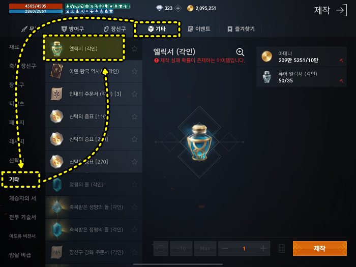 엘릭사 제작은 "제작 -> 기타-> 기타-> 엘릭서 (각인)"순서로 진행됩니다. 제작에 필요한 재료는 아데나 10만과 퓨어 엘릭서 35개인데 실패하면 퓨어 엘릭서 30개를 돌려줍니다. 5번인가 4번 제작했는데 모두 실패했네요. 성공하면 더블클릭해서 사용한 뒤 원하는 스탯 골라서 찍으면됩니다.