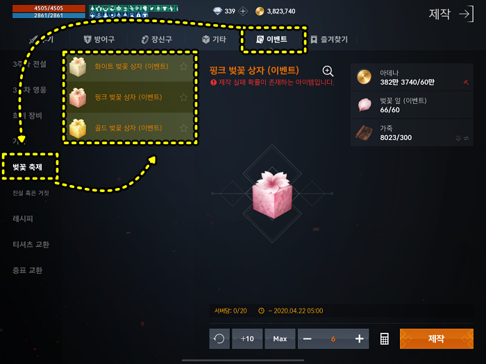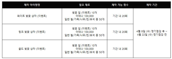 제작 - 이벤트 - 벚꽃 축제로 이동해서 "화이트 벚꽃 상자 / 핑크 벚꽃 상자 / 골드 벚꽃 상자" 이렇게 3개중 골라서 제작합니다. 개당 20개씩 제작 한도가 정해졌고 재료는 "아데나 10만 / 벚꽃 잎 10개 / 가죽이나 나무 등 일반재료 50개" 입니다.