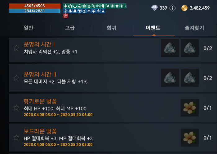 이벤트 기간제 컬렉션입니다. 향기로운 벚꽃은 최대 체력과 마나를 올려주고 보드라운 벚꽃은 절대회북 수치를 올려주네요. 돈드는거 아니니깐 두개다 해주려고합니다. 기간은 5월 20일까지 컬력션이 적용됩니다.