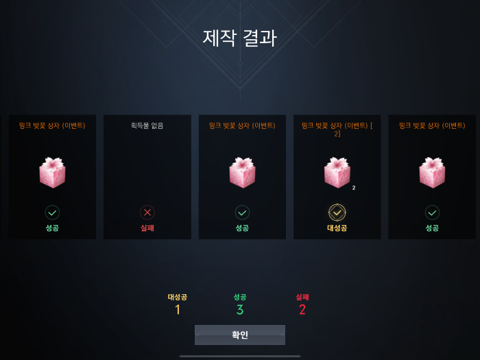 제작한 상자마다 보상은 다릅니다. 화이트 벚꽃은 무기/ 방어구 강화 줌서인데 축줌까지 나오고 핑크는 각종 던전 충전석들 골드는 생명의돌이나 정령의 돌들이 나옵니다. 저는 벚꽃 던전 가볼려고 핑크로 제작해봤습니다.