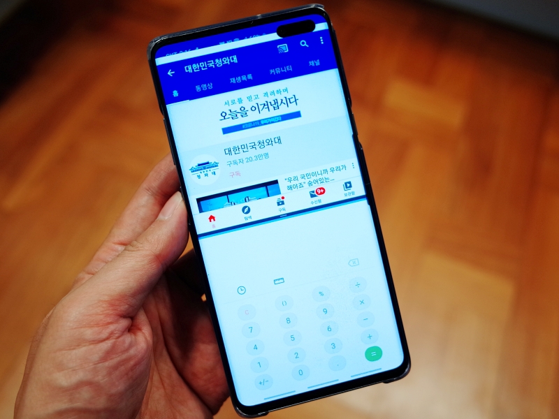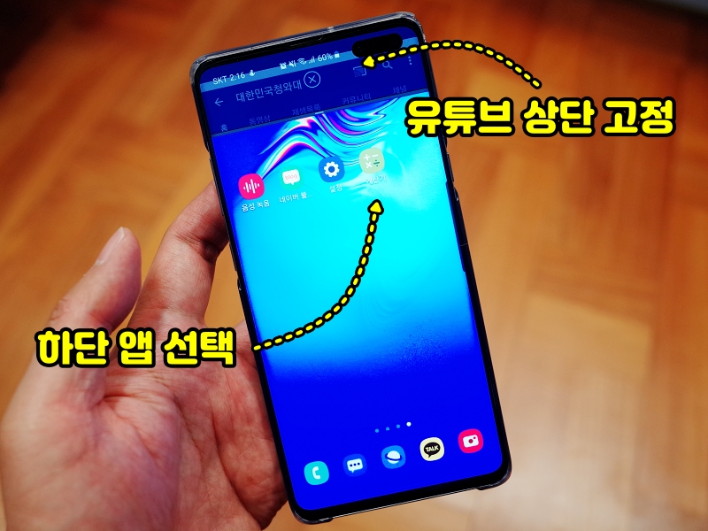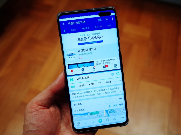 주로 사용하는 갤럭시의 화면입니다. 유튜브는 따로 사진찍기 뭐해서 청와대로 해놨고 하단은 네이버 앱으로 한 화면에 2개의 앱을 사용하는 사진입니다. 이 화면분할 혹은 멀티윈도우를 응용하면 매우 편리하게 사용할 수 있습니다. 유튜브를 보면서 친구와 카톡을 할 수 있고 혹은 인스타그램 하면서 카톡도 할 수 있겠죠. 기존에는 하나의 앱만 사용했는데 2개를 이용할 수 있으니 편리합니다.