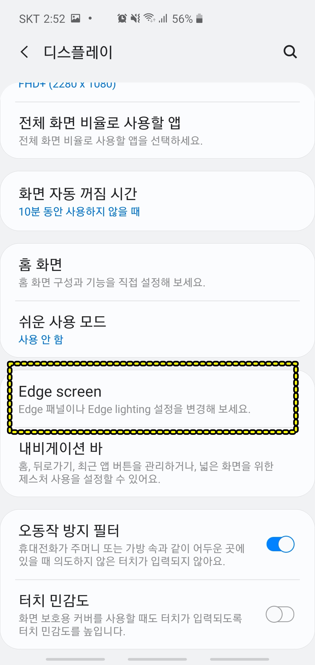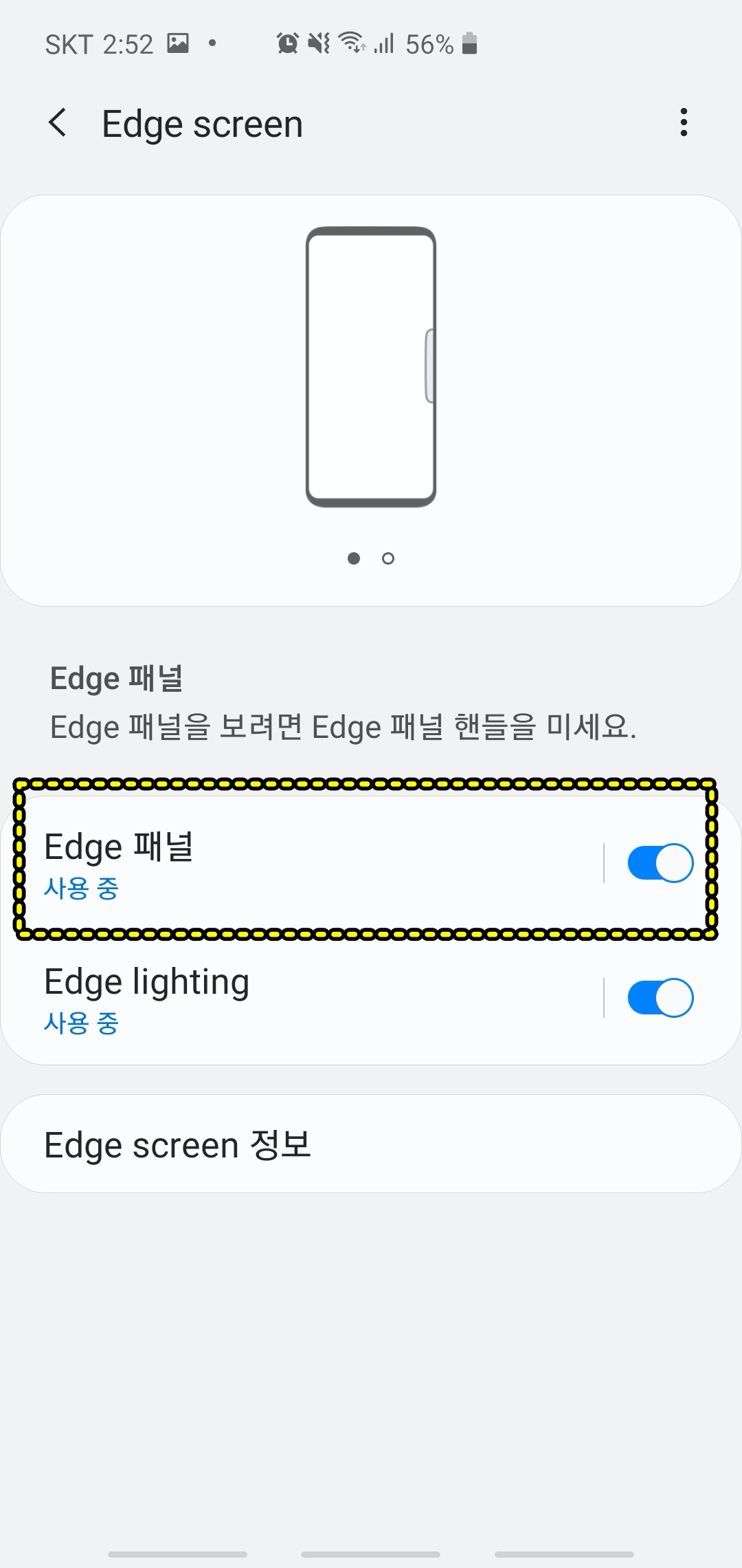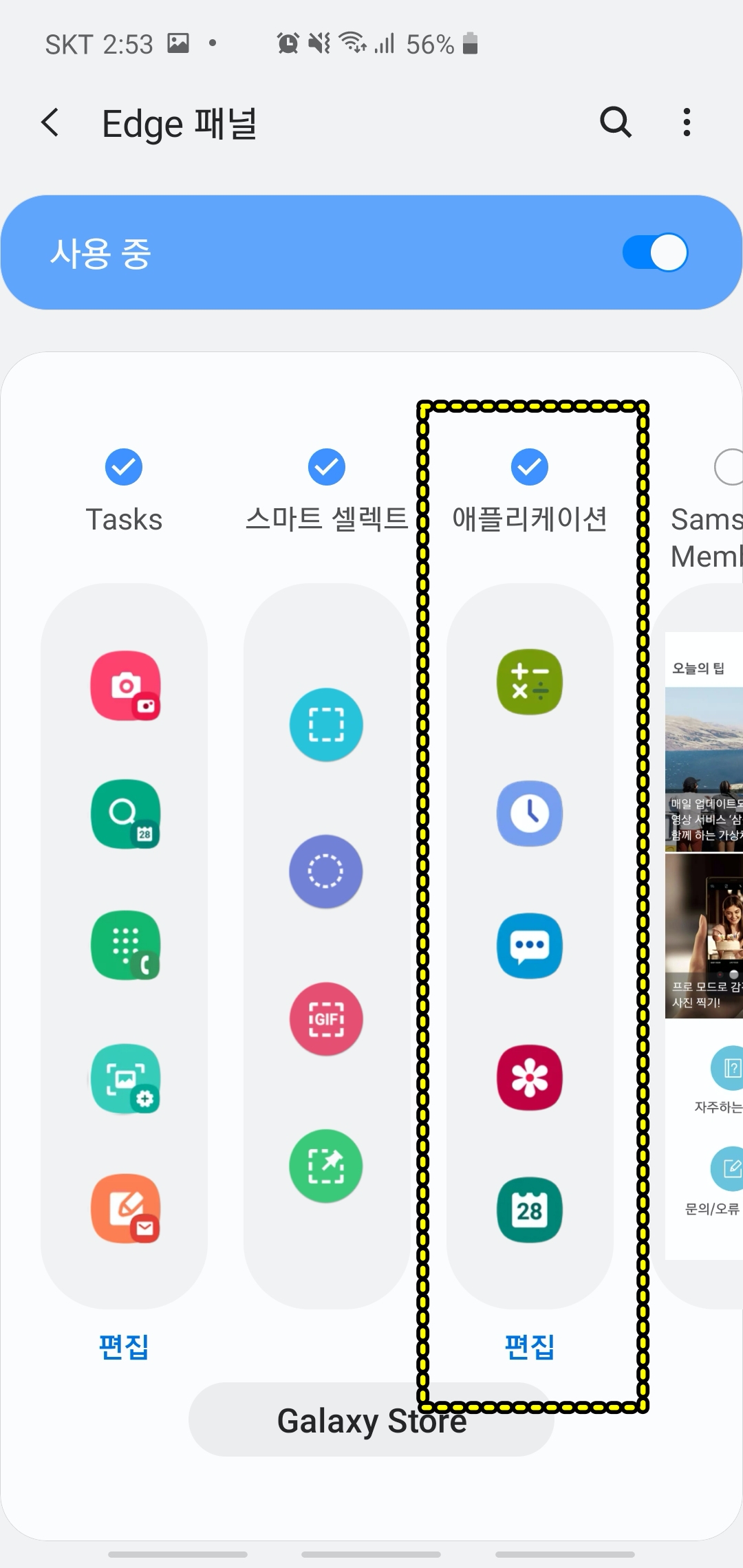 다만 Edge 기능을 활성화 시키고 메뉴에서 해당 기능을 단축키처럼 사용할 수 있습니다. 그래서 설정에서 Edge 패널을 활성화 시킵니다.
