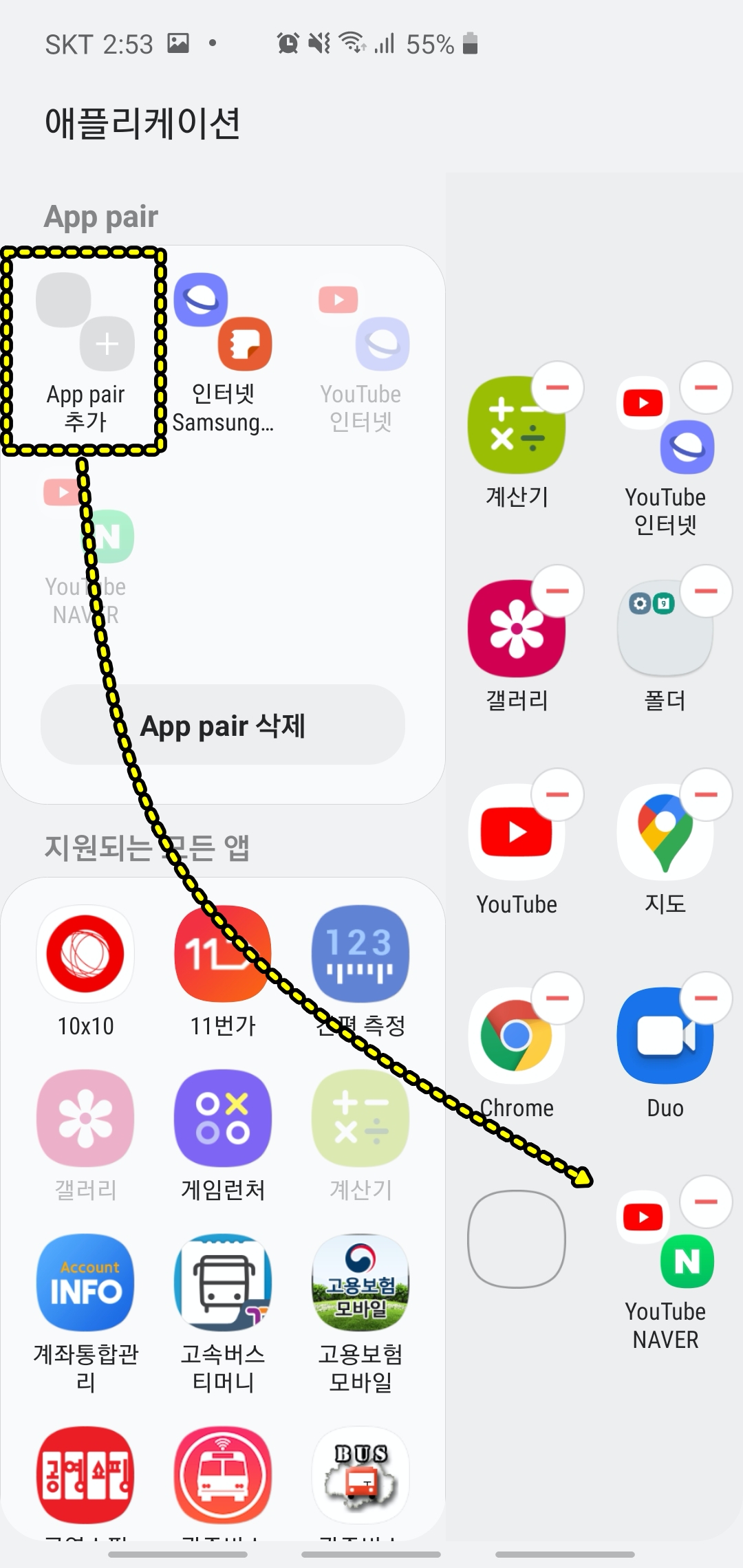 스마트폰 화면에서 엣지 패널을 열어 하단의 편집을 누르면 "App pair 추가" 버튼이 보입니다. 해당 버튼을 눌러서 상단/하단에 위치한 앱을 선택한 뒤 저장하면 우측에 패널에 보이는것처럼 화면분할 app pair가 적용된 아이콘들이 설정됩니다.