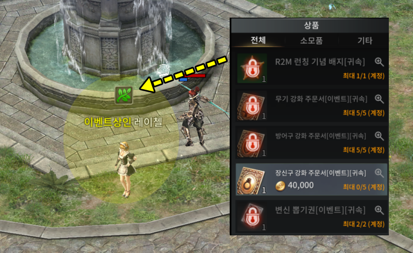 또 지금 이벤트로 각 마을의 "이벤트상인 레이첼"에게서 저렴한 가격으로 각 5장씩 무기/방어구/장신구 강화 주문서를 구매할 수 있습니다. 상점에서 구매하는 강화 주문서와 이벤트로 구입한 강화 주문서를 합치고 거기에 퀘스트 도중에 보상으로 받는 강화 주문서까지 사용하면 +6검에 +4셋 방어구를 쉽게 맞출수 있습니다.