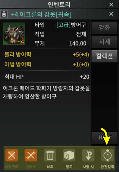 보상으로 받은 이크론 방어구들은 필드에서 사냥하다가 획득한 고급등급의 방어구보다 옵션이나 능력치가 괜찮습니다. 역시나 꾸욱 눌러서 상세정보를 확인한 뒤에 안전 강화를 시켜주세요 방어구는 대부분 +4까지 안전인데 뼈 재질로 만들어진 방어구나 상급 방어구 중에서는 +0에서 +1갈때 파괴되는 아이템도 있으니 주의해주세요.