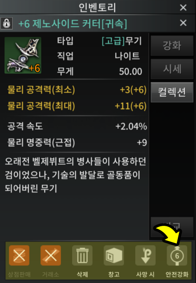초반 퀘스트 보상으로 지급된 "제노 사이드 커터"(아처는 강철 활)는 한손검 무기로 +6까지 안전하게 강화시킬 수 있습니다. 아이템을 꾸욱 길게 눌러서 또는 아이템 터치후 "상세" 버튼을 눌러 해당 아이템의 안전강화 수치와 거래소 판매 여부등이 확인 가능합니다. 무기는 +6강화에서 스톱!