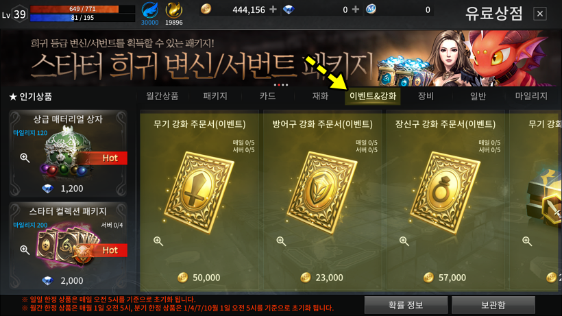 r2 모바일의 우측 상단에 위치한 "상점"을 눌러서 "이벤트&강화"탭에서 무기 / 방어구 / 장신구 강화 주문서를 구입할 수 있습니다. 하루에 각 5장씩 구매가 가능하며 무기 강화 주문서는 5만골드 / 방어구 강화 주문서는 2만3천골드 / 장신구 강화 주문서는 5만7천골드입니다.