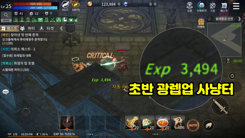 스페셜 던전 탭의 "발레포르 던전"에서 1시간 빡시게 사냥을합니다. 던전 중심으로 가지말고 주변에서 "소라게 혹은 차크라" 이런애들은 약하니깐 그녀석들 잡으세요. 마리당 3400정도의 경험치를 줍니다. 25렙쯤에 들어가서 저는 나올때 29레벨로 나왔습니다.