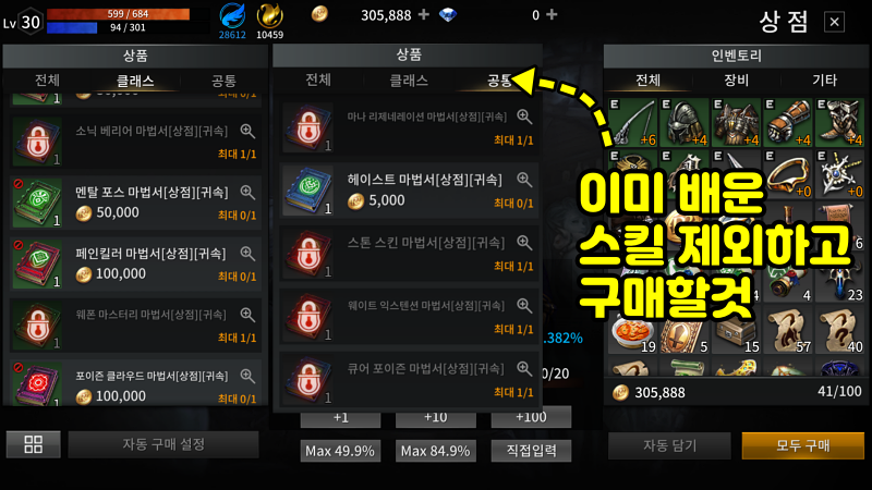그리고 골드가 조금 모이면 마을에서 스킬북을 구매합니다. "스킬북 상인"에게서 공통 스킬 (헤이스트는 퀘스트로 배우는거라 제외)을 모두 구매해서 배우고 퀵슬록에 등록해서 사용합니다 ( 큐어 포이즌과 텔레포트는 제외)