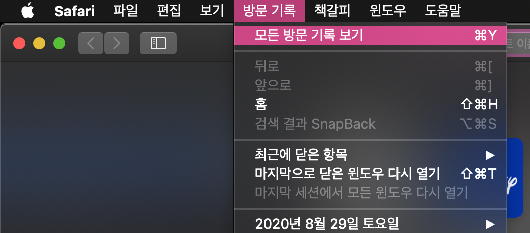사파리 브라우저의 상단 메뉴에서 " 방문 기록 -> 모든 방문 기록 보기"에서 확인이 가능합니다. 단축키는 command + Y