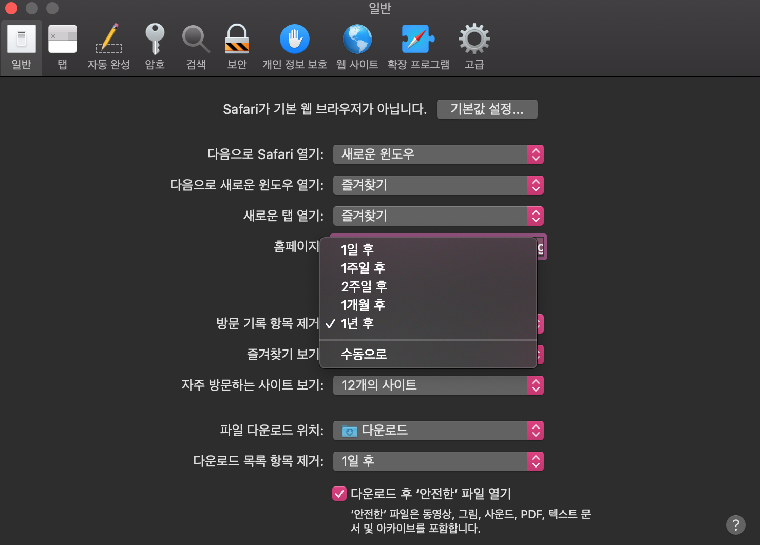 매번 수동으로 방문기록을 삭제하기 귀찮다면 "Safari" -> "환경설정" 메뉴에서 "방문 기록 항목 제거"를 선택해서 날짜를 조절할 수 있습니다. 보통은 1년 후로 지정된 상태인데 가장 빠르게 "1일 후"로 설정 할 수 있습니다. 그러면 다음 날에 자동으로 방묵 내역들이 삭제되겠죠.