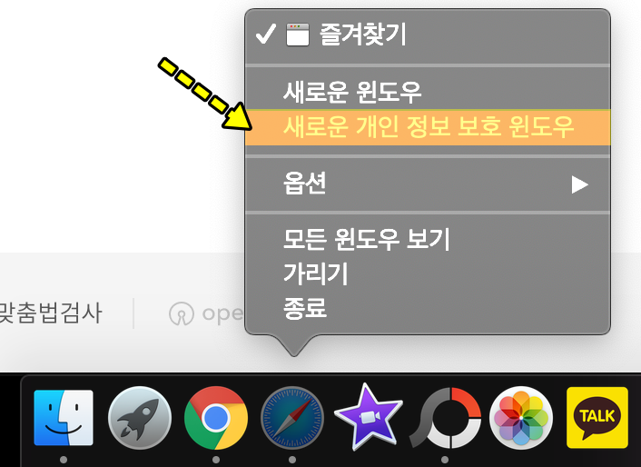 맥북 사파리 아이콘에서 마우스 오른쪽 버튼을 눌러 "새로운 개인 정보 보호 윈도우" 를 선택합니다. 크롬의 시크릿모드와 비슷한 기능으로 사용자의 개인 정보를 보호하는 브라우저입니다. 다만 웹페이지에서 개인정보가 필요한 경우에는 팝업으로 "개인 정보 보호 모드를 풀어주세요"라는 메세지가 출력되기도 합니다. 그럴때는 일반 모드로 사용을 해야겠죠.