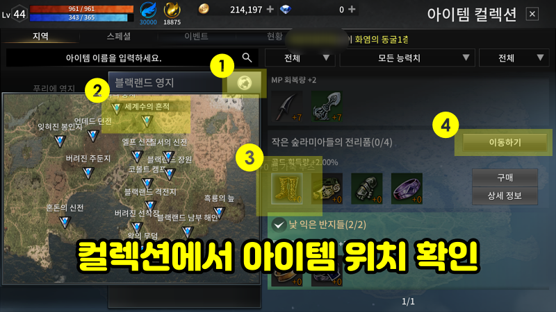 컬렉션에서 "블랙랜드" 영지 옆의 지구 모양을 누르면 맵에 거점들이 표시됩니다. 거기에서 "세계수의 흔적"을 선택하면 우측에 해당 맵에서 획득이 가능한 컬렉션 리스트가 출력되고 "작은 숲라미아들의 전리품" 컬렉션에 "뱀 가죽 부츠"가 포함된 모습을 확인할 수 있습니다. "이동하기" 눌러서 해당 맵으로 바로 이동이 가능합니다.