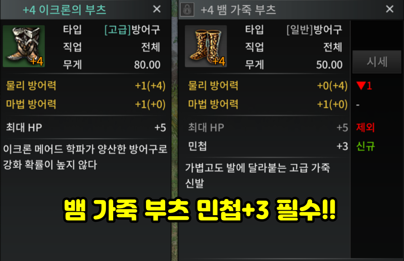퀘스트로 받아서 사용하는 "이크론 부츠"는 물리/마법 방어력 +1에 HP+5 옵션으로 그야말로 기본중의 기본 아이템입니다. 하지만 "뱀 가죽 부츠는 물리 방어력은 없지만 "민첩 +3" 옵션이 붙습니다.