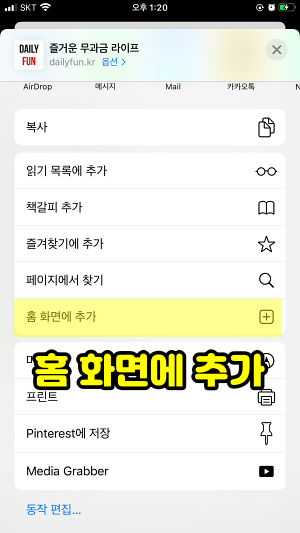 공유하기 메뉴들이 나오는데 밑으로 조금 내려가면 "홈 화면에 추가" 옵션이 있습니다. 선택!