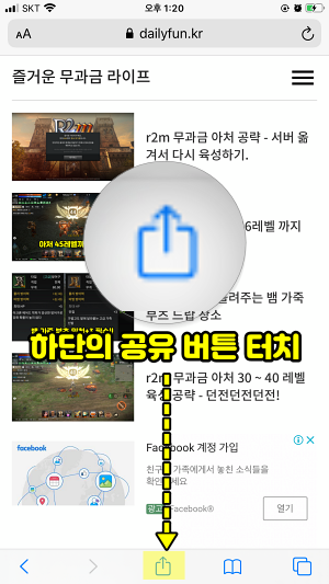 바로가기로 등록하고 싶은 사이트나 홈페이지 화면에서 하단 중앙의 공유하기 버튼을 터치합니다. 다른 사람에게 사파리의 보고 있는 주소등을 공유할도 여기 공유하기 버튼을 이용합니다.