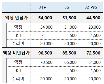 J2 Pro는 액정 반납시 44,500원이며 미반납은 72,500원입니다.