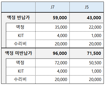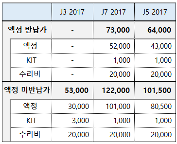 갤럭시 J3 2017은 액정을 따로 반납받지 않아서 액정 미반납가격만 공지되어있습니다. 액정 자재 가격에 kit 수리비를 모두 포함해서 53,000원입니다. J5 2017는 금액이 기존의 j 시리즈에 비해서 조금 나갑니다. 반납 가격이 73,000원이고 미반납의 경우에는 122,000원입니다. J5 2017는 파손된 액정 반납시 64,000원 미반납시에는 101,500원으로 가격이 예상됩니다.
