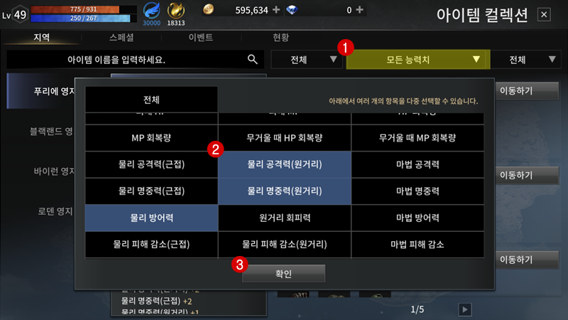 아이템 컬렉션 메뉴 우측 상단에 "모든 능력치"를 선택하면 컬렉션을 고를 수 있습니다. 아처니깐 "민첩" / "물리 공격력(원거리)" / "물리 명중력(원거리)" / "물리 방어력" 우선 이정도만 선택하고 확인을 누르면 됩니다. 나이트의 경우는 힘 + 근접 공격 + 근접 명중 + 방어력 이렇게 검색하면 되겠죠.