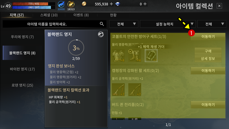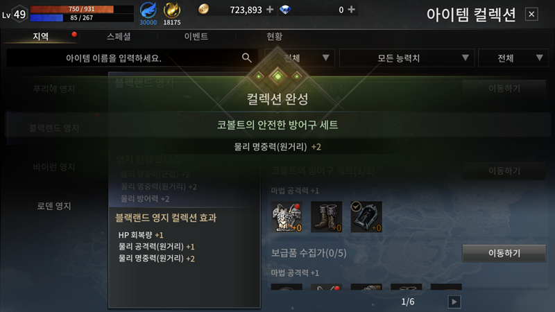 푸리에 영지에 뭐 없어서 좌측의 맵선택에서 "블랙랜드 영지"를 선택하니 "코볼트의 안전한 방어구 세트" 컬렉션이 보이네요. 보급용 미늘부츠는 퀘스트 하나다가 먹었는데 남은 2개의 아이템은 필드에서 사냥으로 습득해야겠습니다. 요거 컬렉션 완성하면 "물리 명중력(원거리)+2"입니다.