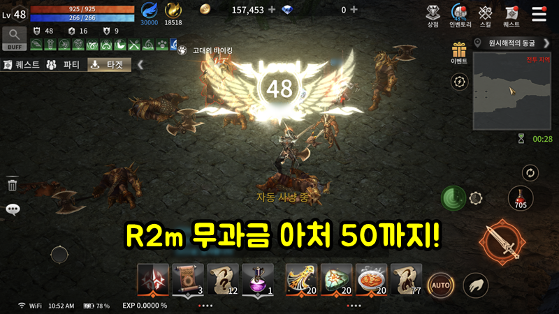 50까지는 뭐 딱히 공략이 없어요. 지금 49레벨 40%정도인데 이 글을 쓰는 시간에도 아이폰에서는 열심히 사냥으로 경험치를 올리고 있습니다. 아마 내일 스페셜 던전 각 2시간씩 플레이하면 50레벨에 도달할 예정입니다.