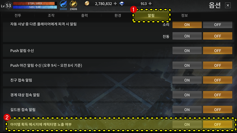 익명의 캐릭터 설정 방법은 매우 간단합니다. "설정 -> 알림 -> 제일 하단 -> 아이템 획득 메시지에 캐릭터명 노출 여부"에서 자신의 이름을 알리고 싶으면 on / 나는 내 아이디를 숨기고 싶다면 OFF를 선택하면 됩니다.