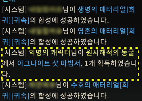 채팅을 보면 바로 아시겠지만 모자이크를 한 부분들은 모두 캐릭터 명을 숨기지 않은 유저들입니다. 희귀 등급의 아이템을 획득하면 이렇게 전체 공지로 올라오는데 한 유저만 "익명의 캐릭터"로 알림이 뜹니다. 이름이 익명의 캐릭터가 아니라 자신의 캐릭명을 숨김 설정을 한 유저입니다.