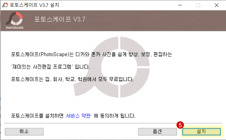 포토스케이프의 설치 화면인데 "집,회사,학교,학원 등 모두 무료로 사용할 수 있는 프로그램이라서 더욱 마음에 듭니다. 회사의 경우는 자칫 잘못하면 프리웨어들 라이센스 위반으로 걸리는 경우가 종종있거든요. 설치 버튼을 누르면됩니다.
