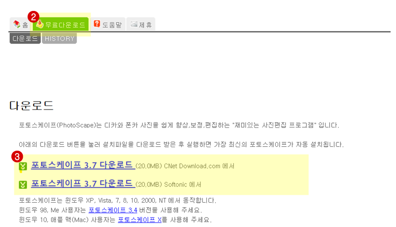 포토스케이프 홈페이지 상단 메유에서 "무료다운로드"를 선택하면 2곳의 다운로드 링크가 보입니다. 둘다 같은 파일이니 아무곳에서나 받아도 상관없습니다. 주의할 부분은 윈도우 사용자는 "포토스케이프" 맥 사용자는 "포토스케이프x"를 다운받아 설치해야합니다.