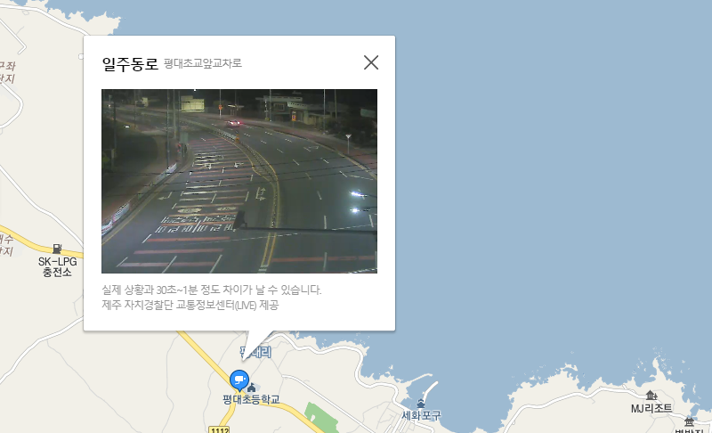 제주도의 일주동로에 위치한 cctv를 선택했습니다. 늦은 시간대라 그런지 차량이 거의 없네요. 지도상에서 확인하는 CCTV들은 실제 상황과 30초~1분정도 차이가 날 수 있이며 1분의 영상만 제공하고 그 뒤로는 다시 버튼을 눌러서 재생할 수 있습니다.