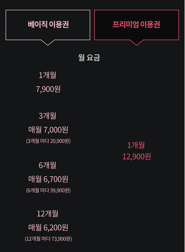 왓챠 요금제는 "베이직"와 프리미엄" 두 종류로 구분됩니다. 베이직은 기본 1개월에 7,900원이고 3개월 6개월 12개월로 장기 결제를 하는 경우는 금액대가 조금씩 저렴해집니다. 1개월은 7,900원이고 12개월이면 6,200원으로 이용이 가능한 방식입니다. (예전에는 4,900원짜리 요금제가 있었지만 지금은 가입불가)