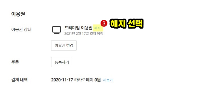 이용권의 모습이 보입니다. 저는 프리미엄 이용권을 이용중이고 따로 해지나 탈퇴를 하지 않는다면 자동으로 2021년 2월 17일에 결제가 될 예정입니다. 프리미엄 이용권 글씨 옆의 "해지" 버튼을 누르면 자동결제가 진행되지 않고 해지 상태로 변경됩니다.