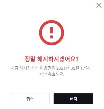 해지를 누르면 팝업으로 정말 해지하시겠어요?로 다시 한번 물어봅니다. 안내된 내용처럼 해지하면 이용권의 서비스 기간은 보장해줍니다. 즉 저는 2월 17일까지 이용이 가능하고 그 뒤로는 사용 불가겠죠.