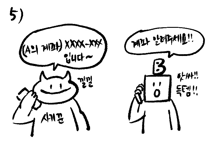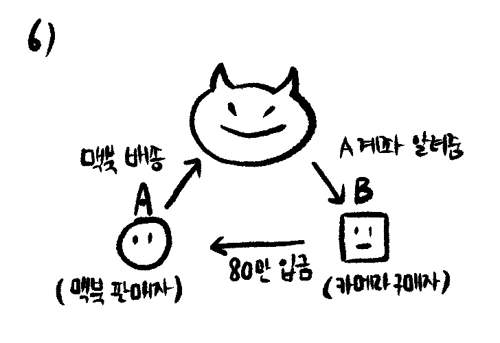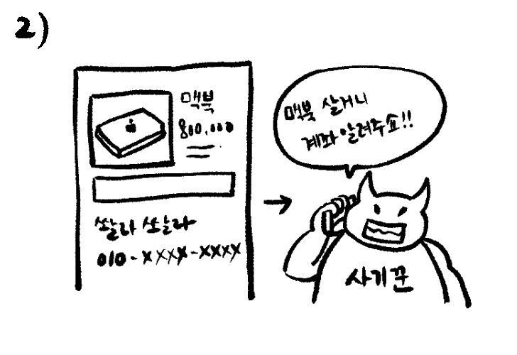 구매자 B씨는 판매자 (사기꾼)에게 연락을 해서 계좌를 물어봅니다. 그리고 판매자(사기꾼)은 앞에 맥북을 판매한다던 A씨의 계좌를 알려줍니다. 구매자 B씨는 사기꾼의 계좌가 아닌 판매자 A의 계좌에 입금을 하게되는거죠. 물론 구매자 B씨는 아무것도 모릅니다.