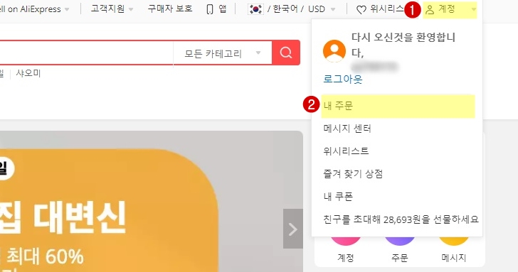 알리익스프레스 메인 홈페이지 우측 상단의 "계정"을 누르고 나타나는 메뉴 중에서 "내 주문"을 선택합니다.