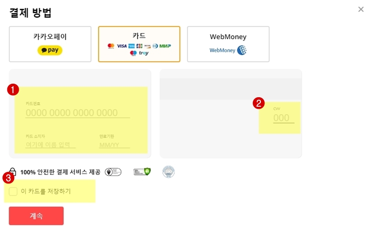 카드 번호와 카드 소지자의 영문 이름 만료기간을 입력하고 카드 뒷면의 CVV 3~4자리 숫자도 같이 입력합니다. 앞으로 해당 카드를 계속 사용할거면 "이 카드를 저장하기"에 체크를 한뒤에 계속 버튼을 눌러주면됩니다.