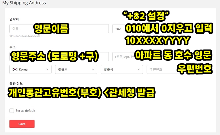이렇게 입력하고 기본값으로 설정 (set as default) 체크 한 뒤에 Save를 눌러 저장하면 배송 주소 입력이 모두 완료됩니다.