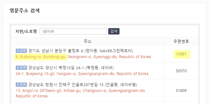 예를 들어서 분당구 불정로 6이라면 영문주소 검색에 나온 결과에서 "6, Buljeong-ro, Bundang-gu," 부분을 복사해서 붙여넣기하면 됩니다. 그 뒤의 성남시 경기도는 하단에 선택하기에서 고르는 부분이니까요. 우편번호도 복사 붙여넣기하면 끝납니다.