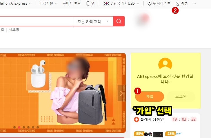 메인 페이지 우측에 보면 "Aliexpress에 오신 것을 환영합니다." 메세지와 함께 보이는 "가입" 버튼을 선택하면됩니다. 아니면 우측 상단에 위치한 "계정"을 눌러서도 가입이 가능하구요.