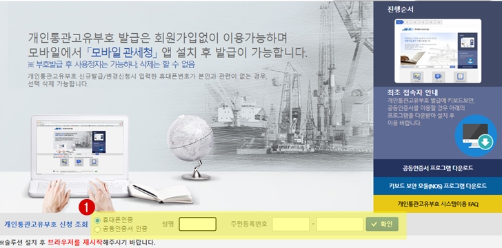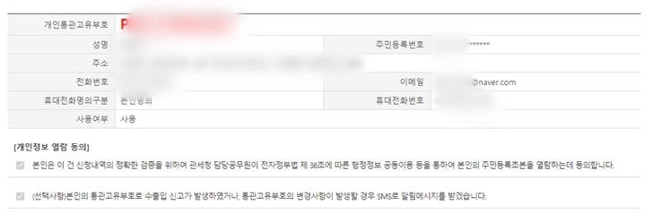 관세청 유니패스 사이트에 접속해서 하단에 위치한 "개인통관고유번호 신청 조회"에서 휴대폰 인증과 공인인증서 인증중 하나를 선택하여 "성명"과"주민등록번호"를 입력한 뒤에 확인 버튼을 누릅니다.